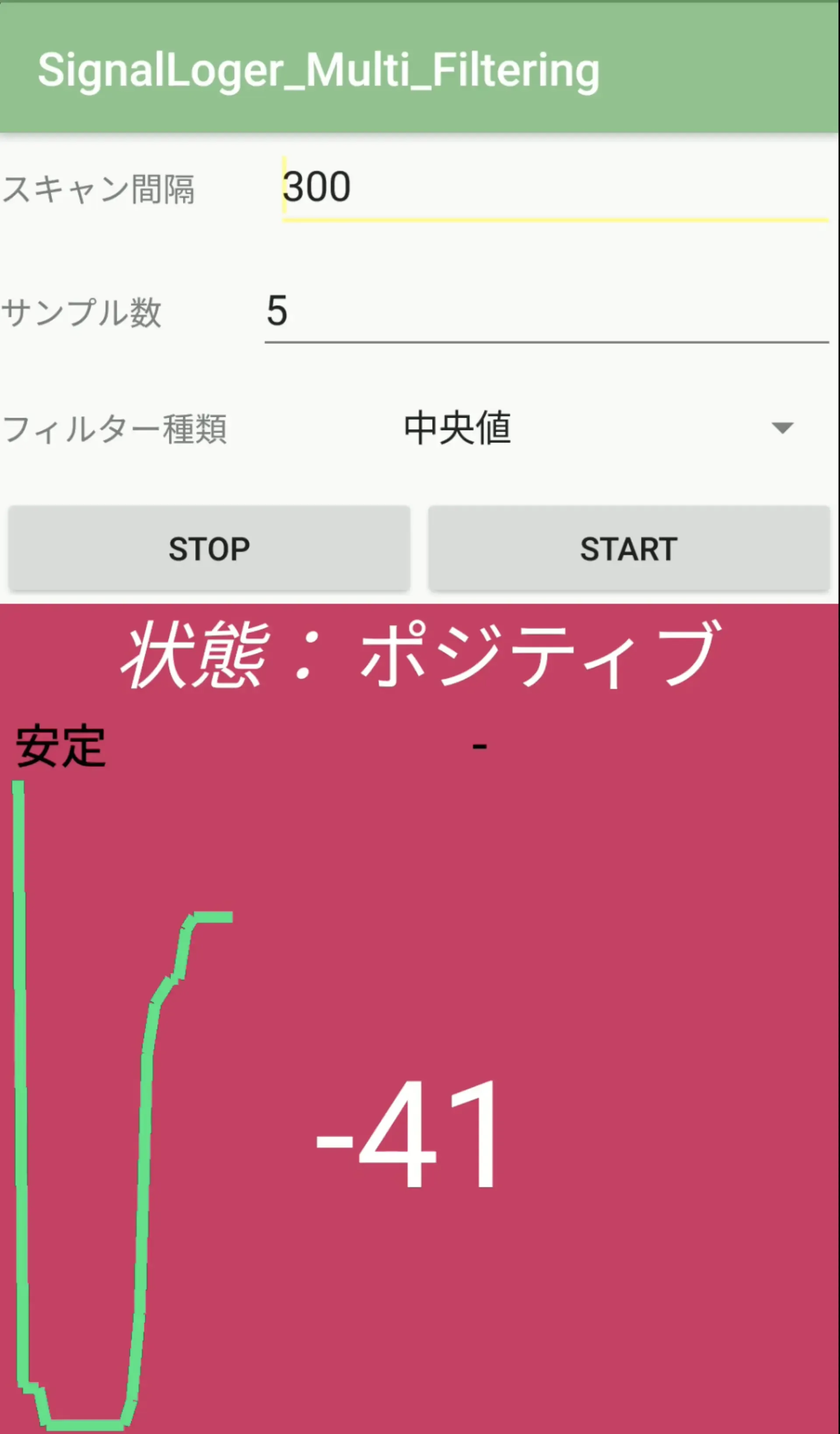 そのため今回,状態推定に適切な方法でビーコンを設置できるよう検討の支援を行うアプリケーションを作成した. 扉の開閉などによって変化する受信電波強度の変化は人の目では当然見えない. そこで受信電波強度のグラフの表示とリアルタイムな状態推定結果を表示し,さらに推定結果の変化を音や色で表すことで,どういう設置方法が効果的なのか試すことができ,BLEビーコンを状態推定に適した方法で設置することができる.