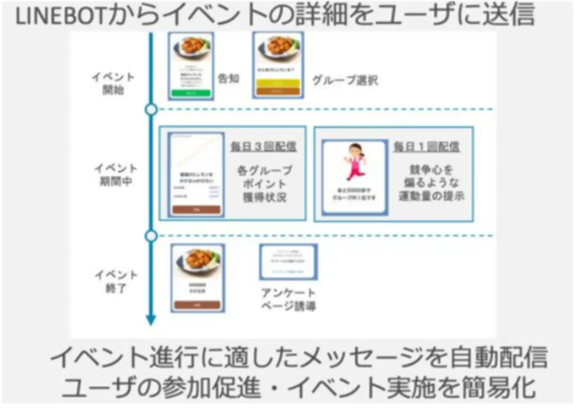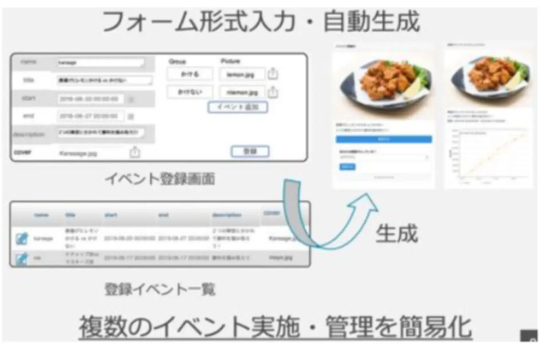 ライフローグデータを用いて,複数グループ間の活動量提示システムの構築と,グループに所属する人の運動モチベーション向上,運動促進を目標とする. 我々はこれまで,運動量取得の自動化と,競争心と貢献心を取り入れた提示システムを実装・運用を行ってきました. 本学会では,継続的なモチベーション刺激のため,イベント管理と LINEBot を用いたイベント機能,今後の研究活動について発表を行いました.