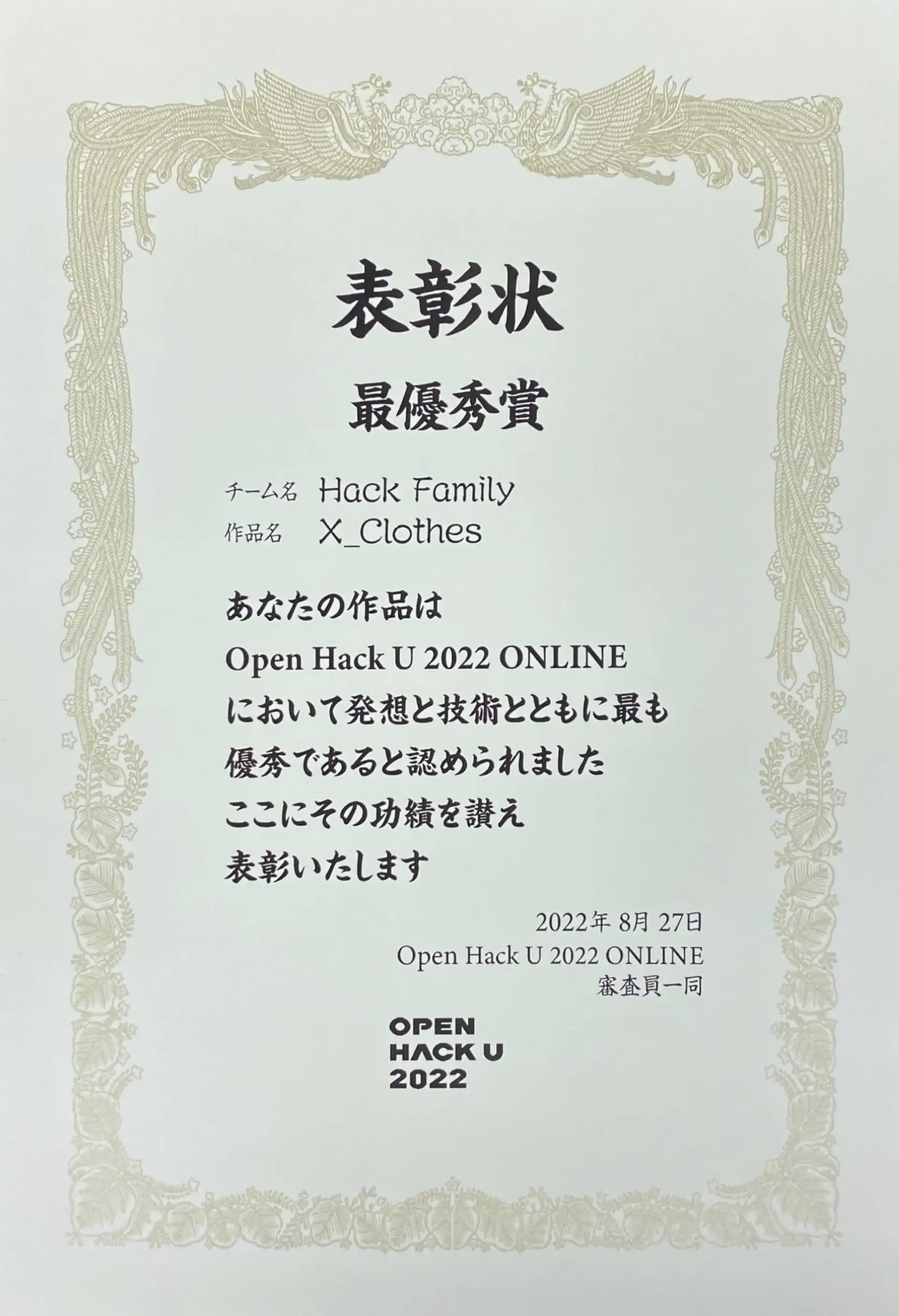 大学生のうちに,プログラミングの大会に一度でも出てみたいと思いこのHack Uに参加しました. 主にWebのフロントエンドを担当し,研究室の先輩からフォローをもらいながら実装していきました. 途中で困難に当たることも多かったですが,だからこそ優勝できたことは嬉しかったです. この経験を今後に活かしていきたいと思います.
