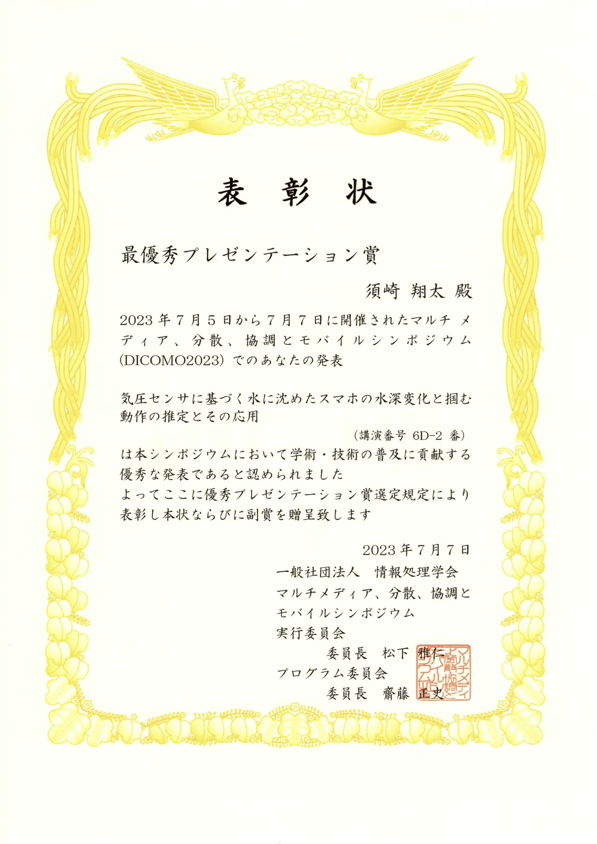 また須崎さんは 最優秀プレゼンテーション賞とベストカンバーサント賞を受賞しました.