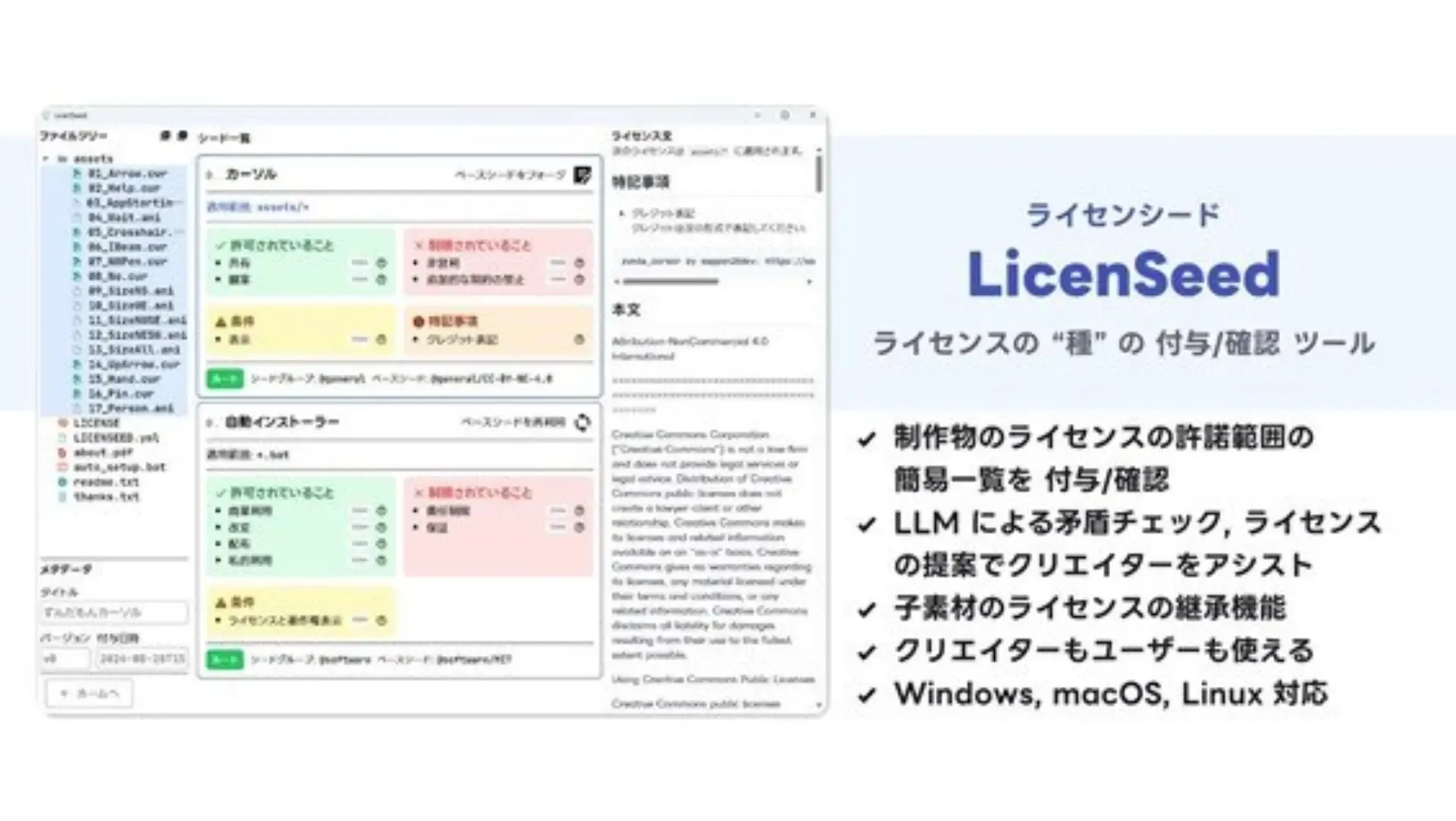 LicenSeed は,クリエイターの制作物に対するライセンスの付与と,ユーザーのライセンスの確認ができるツールです.ユーザーの約8割が著作権について正確に知っているという自信がなく,クリエイターの約4割が自身の制作物に対して著作権意思表示していないという文化庁の調査に着目し,ユーザーが制作物のライセンスを理解し,従いやすくする仕組みをつくることを目標に制作しました。許諾範囲の簡易一覧の表示や,子素材のライセンスの継承ができます.