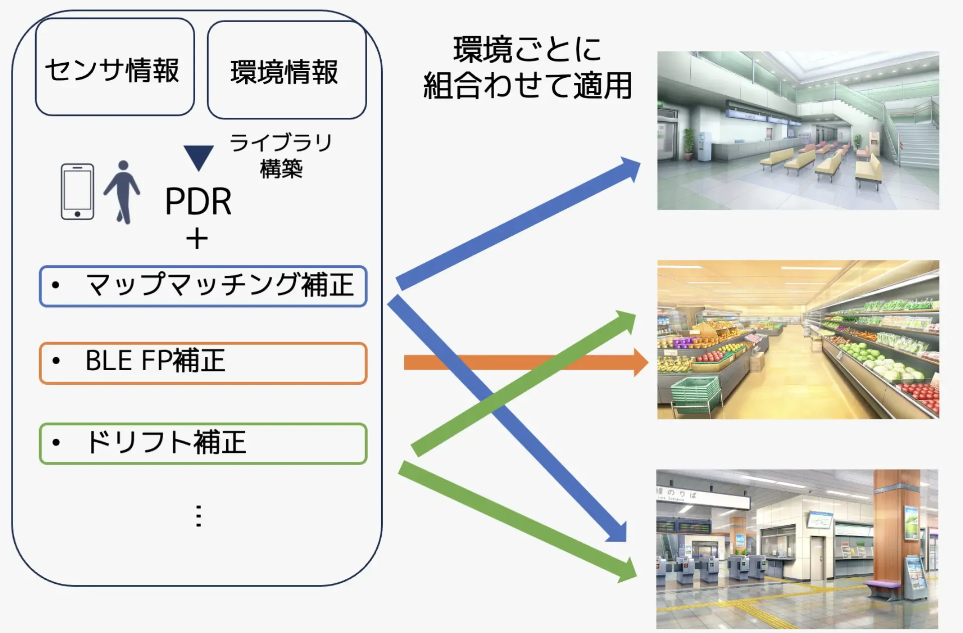 屋内環境における位置推定は様々なサービスや業務の基盤として重要性を増している。近年ではPDRと電波強度を組み合わせた手法やフロアマップ情報を活用したマップマッチング手法など、複数の手法を統合したアプローチが提案されている。しかしこれらの手法の多くは特定の環境を想定して設計されており、異なる環境への部分的な適用は困難である。そこで本研究では様々な環境や状況に対応可能なPDRベースの3次元屋内位置推定ライブラリの検討を行った。本ライブラリでは加速度センサとジャイロセンサによるPDRの基本処理に加え、気圧センサを用いた階層判定による3次元位置推定を行った。また、フロアマップ情報による歩行可能領域の制約やWi-Fi/BLE電波強度情報による位置補正など、利用可能な環境情報に応じて適切な補正手法を選択的に適用可能にした。具体的には補正アルゴリズムを独立したモジュールとして実装し、新たな補正手法の追加や既存手法の組み合わせを容易にする設計を行った。ライブラリの評価では、xDR Challenge 2023の環境で検証を行い、速度誤差や障害物回避要件で特に高いスコアを達成した。また本ライブラリの他環境への適用可能性として、駅構内と大学キャンパスでの検討を行った。
