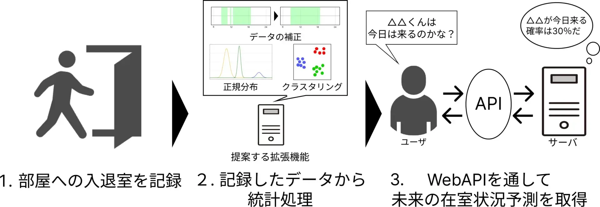 研究室やオフィスのメンバが来訪する時間の情報をワークリズムといい,対面コミュニケーションを促進する重要な要素である.ワークリズムを他のメンバと把握し合えば効率的な連絡や時間調整が可能になるとされている. 本研究では,在室管理システムについて過去の在室情報を基に未来の在室状況を予測する拡張機能とその汎用的なAPIの実現,同 API を用いた来訪促進システムを提案する.提案するシステムは未来の在室状況予測の結果と同じ趣味などの会話の種を持つメンバ同士によるグループから来訪を促す.コミュニティ全体での来訪頻度の向上とメンバ間の対面機会増加によるコミュニケーションの活発化が期待できる