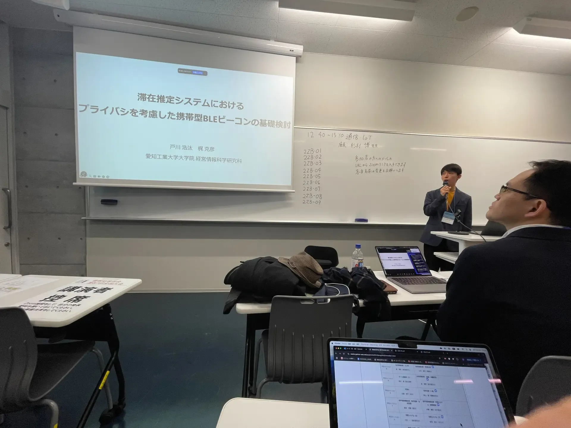 M1の戸川浩汰です。今回は修士課程から取り組んでいる研究について発表しました。修士ということで自分のやりたい研究テーマをかなり自由に楽しくやらせてもらっている中で、奨励賞もいただけ研究に対するさらなるモチベーションとなりました。今後は試作したBLEビーコンを本格的に製作し新たな携帯型BLEビーコンの標準となるよう、さらなる研究に取り組んでいきます!